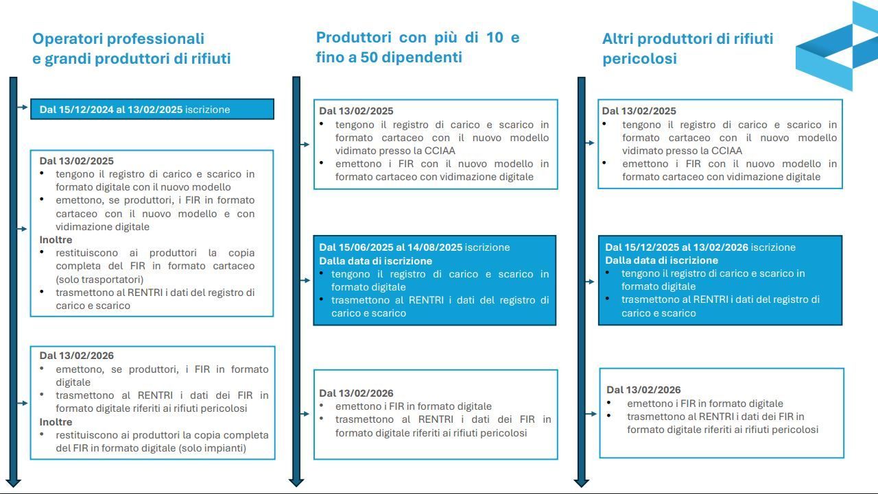 - dal 13 febbraio 2025 per enti ed imprese che effettuano il trattamento dei rifiuti, trasportatori e intermediari di rifiuti, consorzi per il recupero di specifiche tipologie di rifiuti, enti e imprese produttori di rifiuti pericolosi e non pericolosi derivanti da lavorazioni industriali e artigianali e da trattamento di rifiuti, acque e fumi con più di 50 dipendenti;